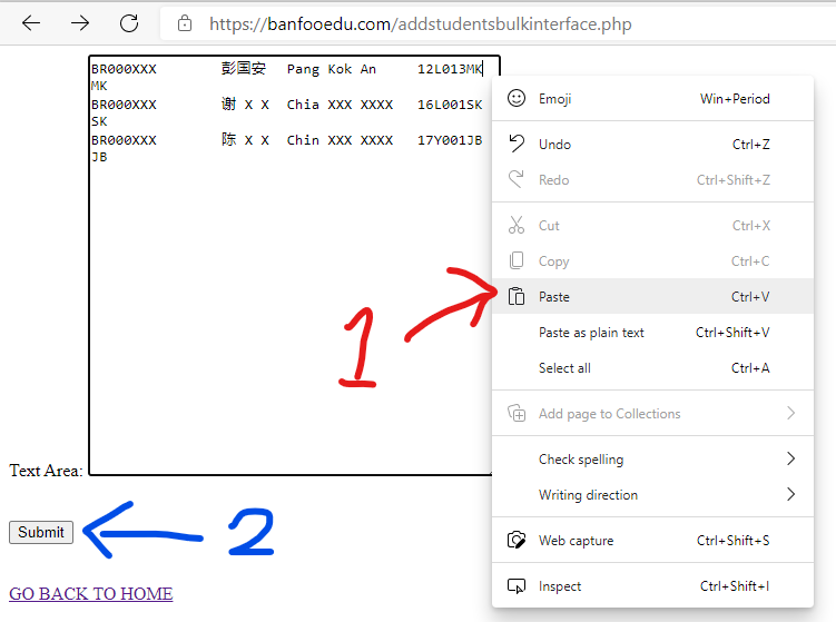 Figure 1 : Adding students using Excel file (Click the above image to enlarge) Go back to top